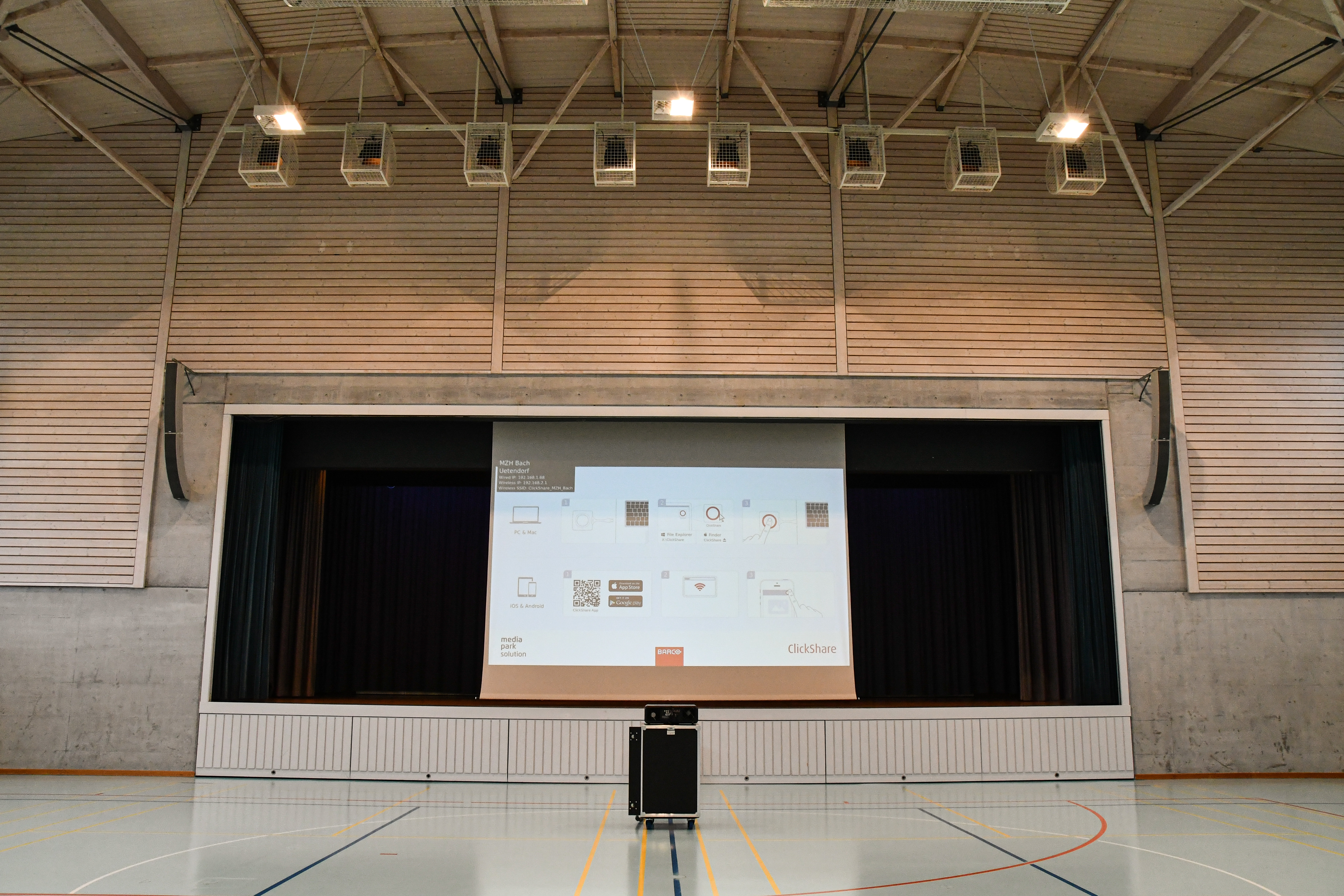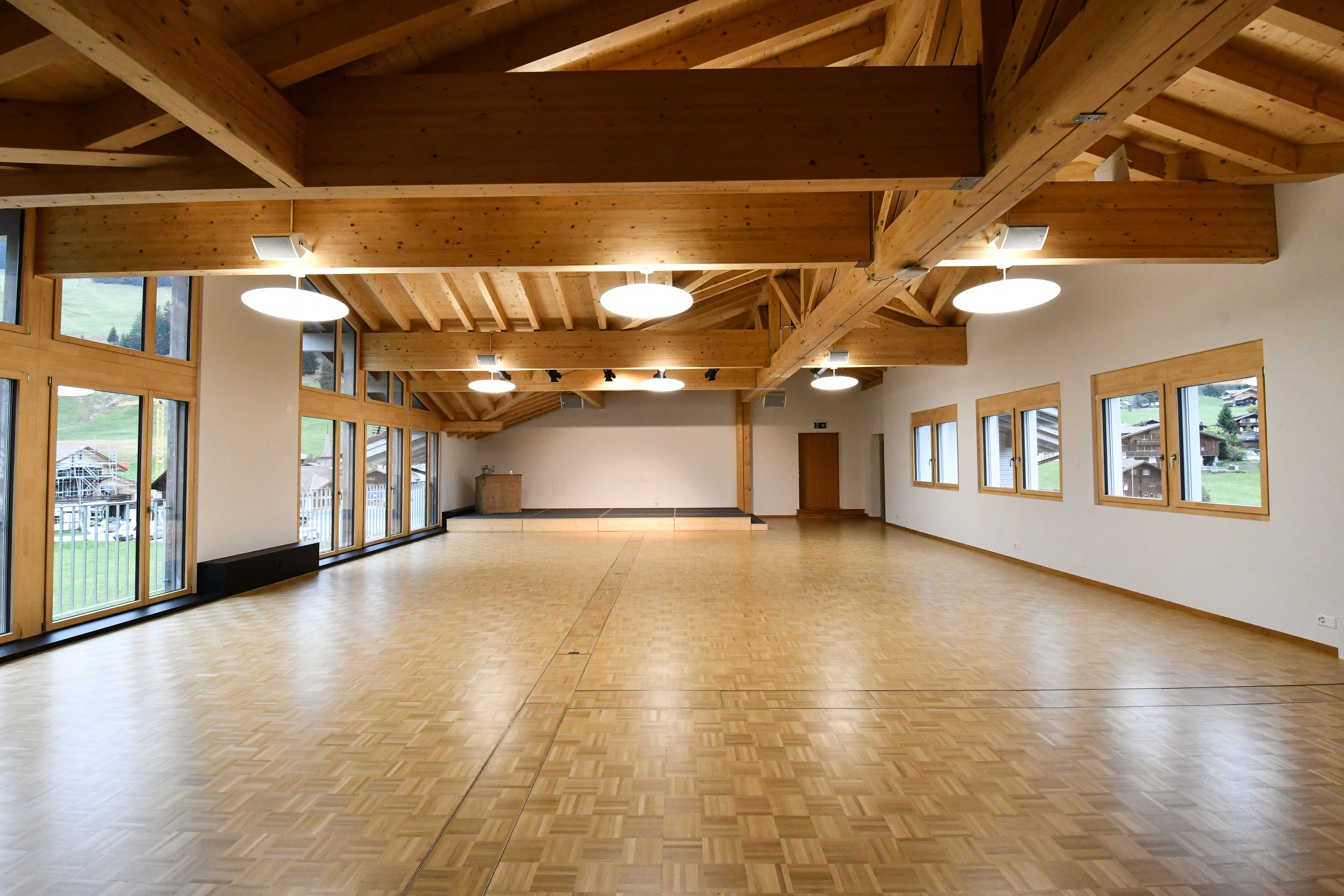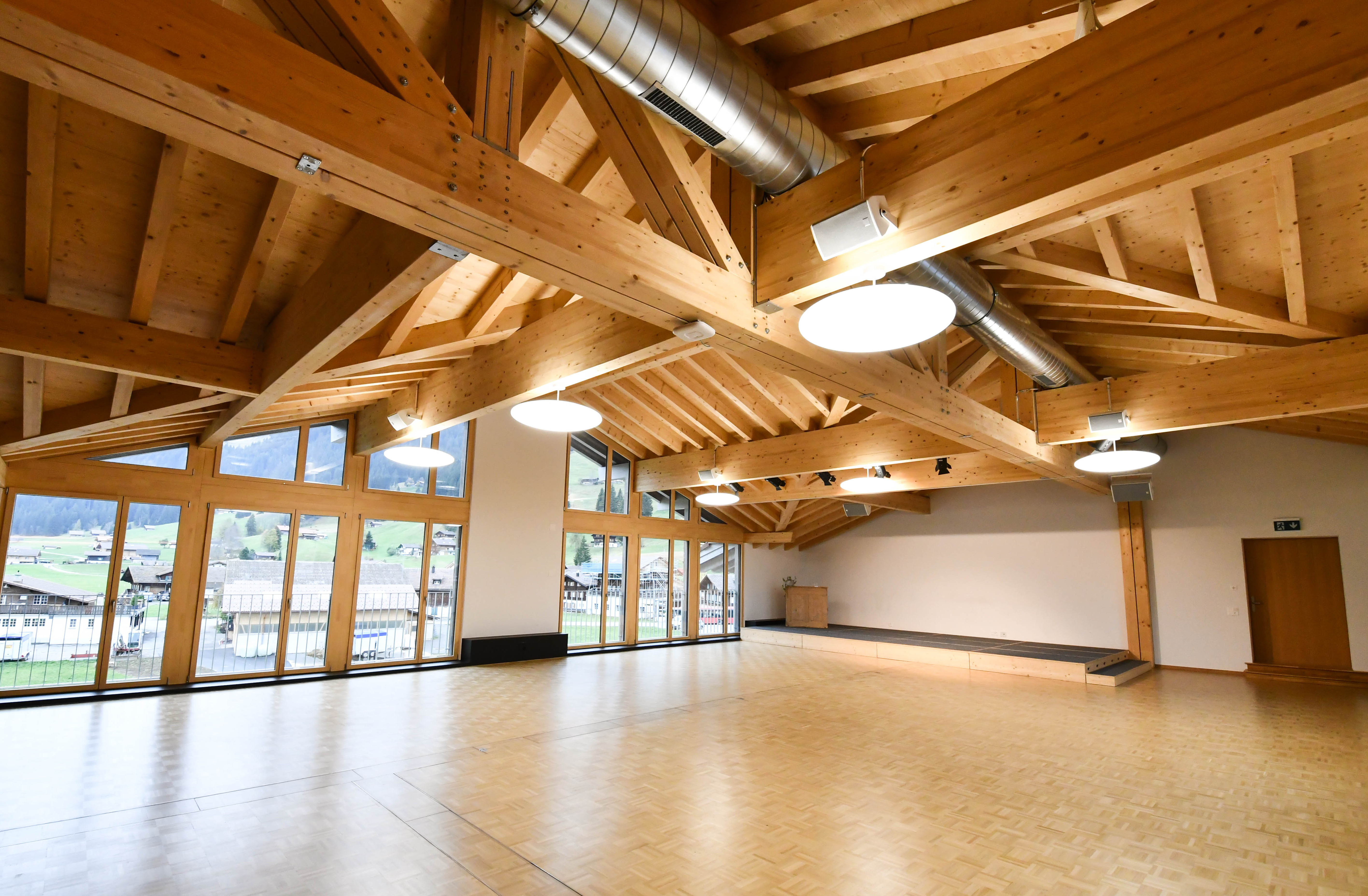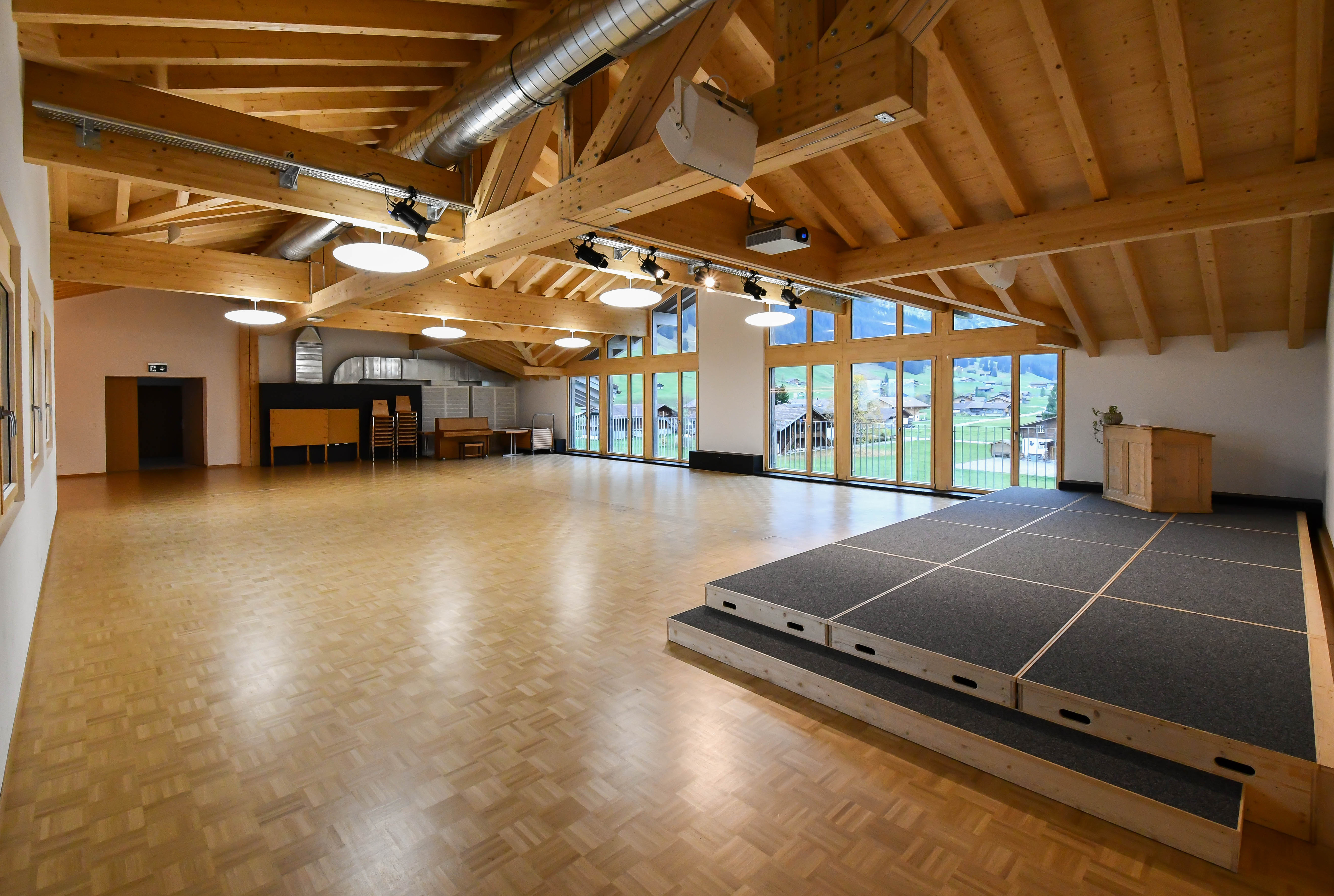 Die Aula im Schulhaus Boden in Adelboden dient Tagsüber hauptsächlich der Schule als Singsaal, Sporthalle oder für Theaterproben.