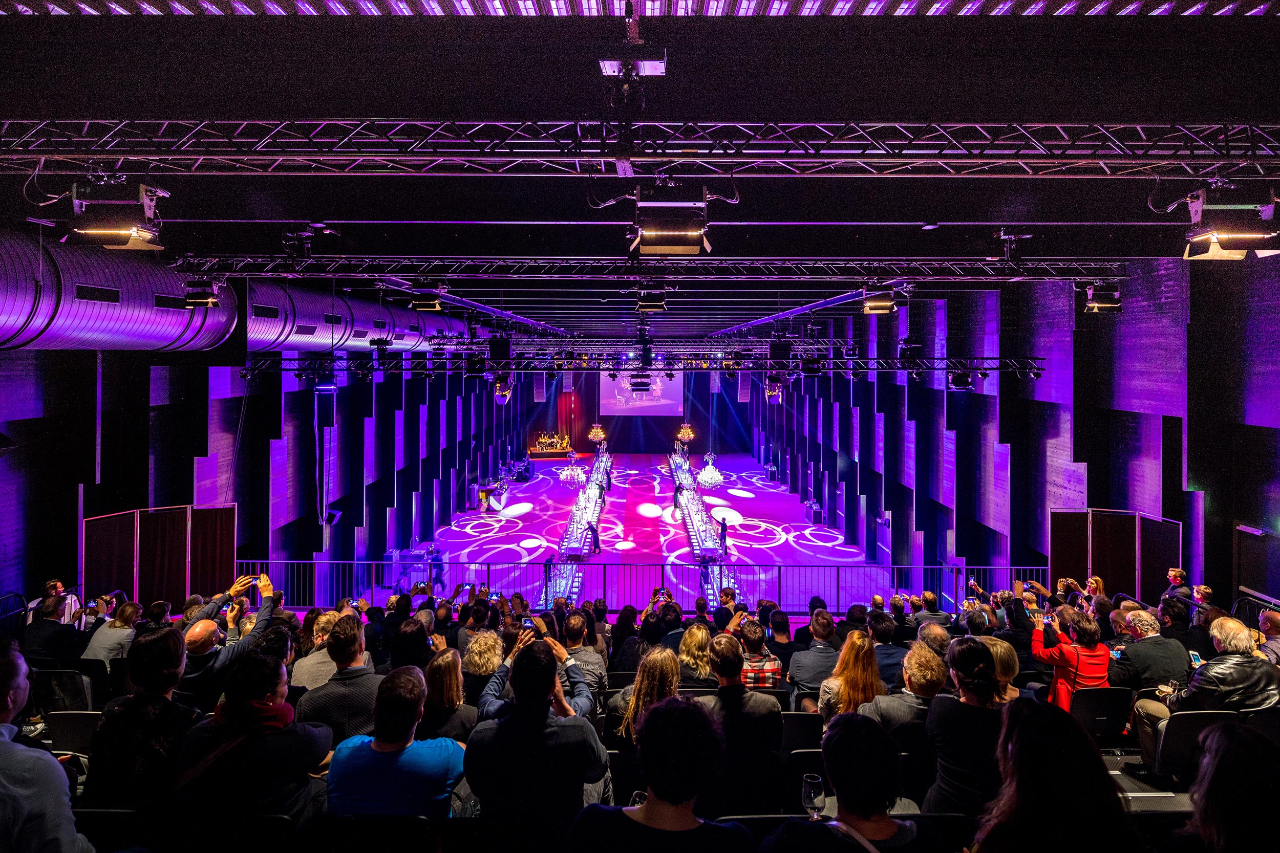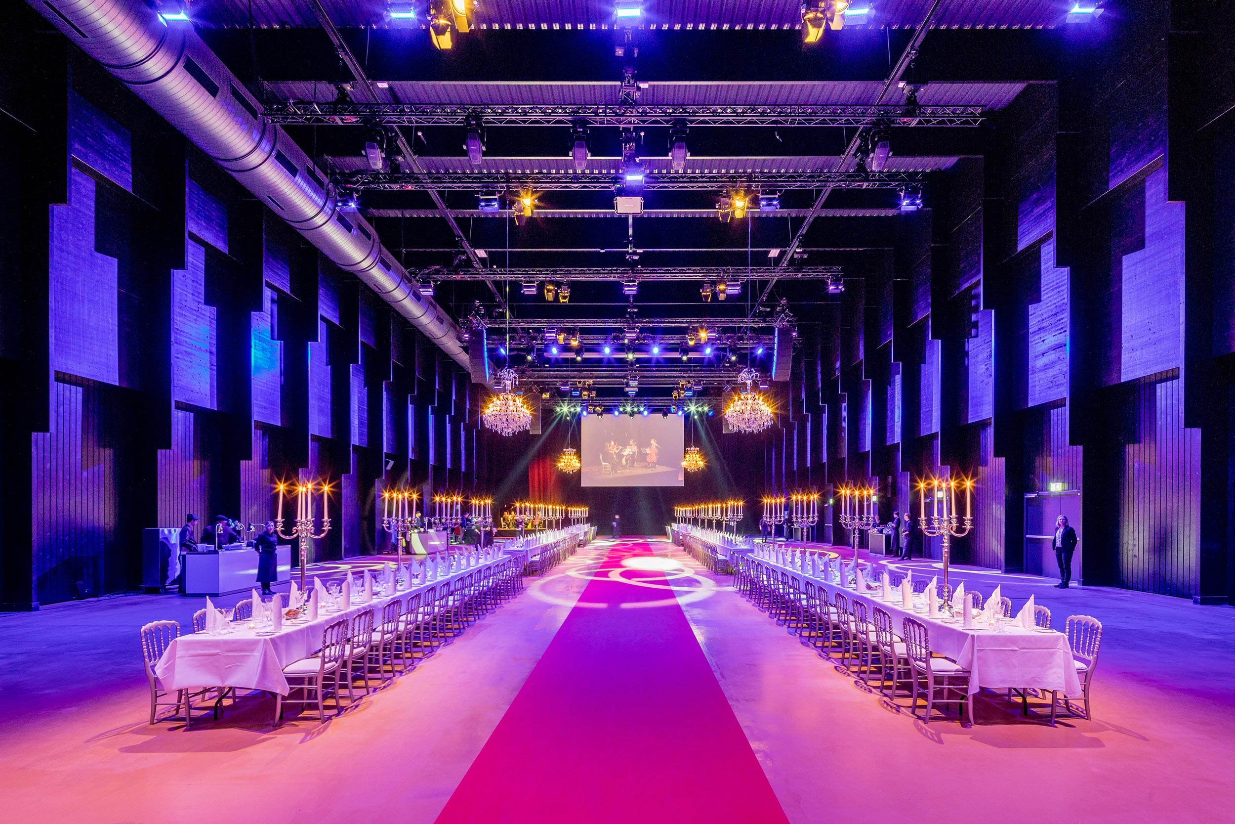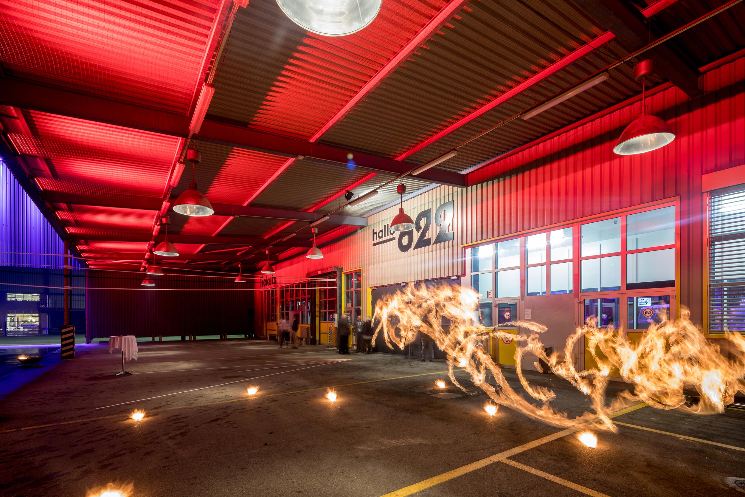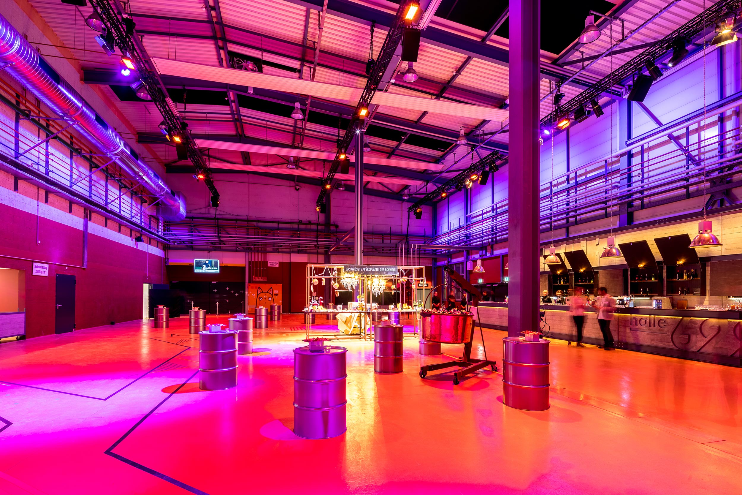 Dank der 11 Meter hohen Decke und dem konservierten Industrieflair bildet sie einen beeindruckenden Kontrast zu den übrigen Veranstaltungsflächen auf dem Areal. Bereits beim Entree bietet sich den Gästen eine spektakuläre Sicht in die Halle durch den Zugang über die grosse Galerie im 1. OG.